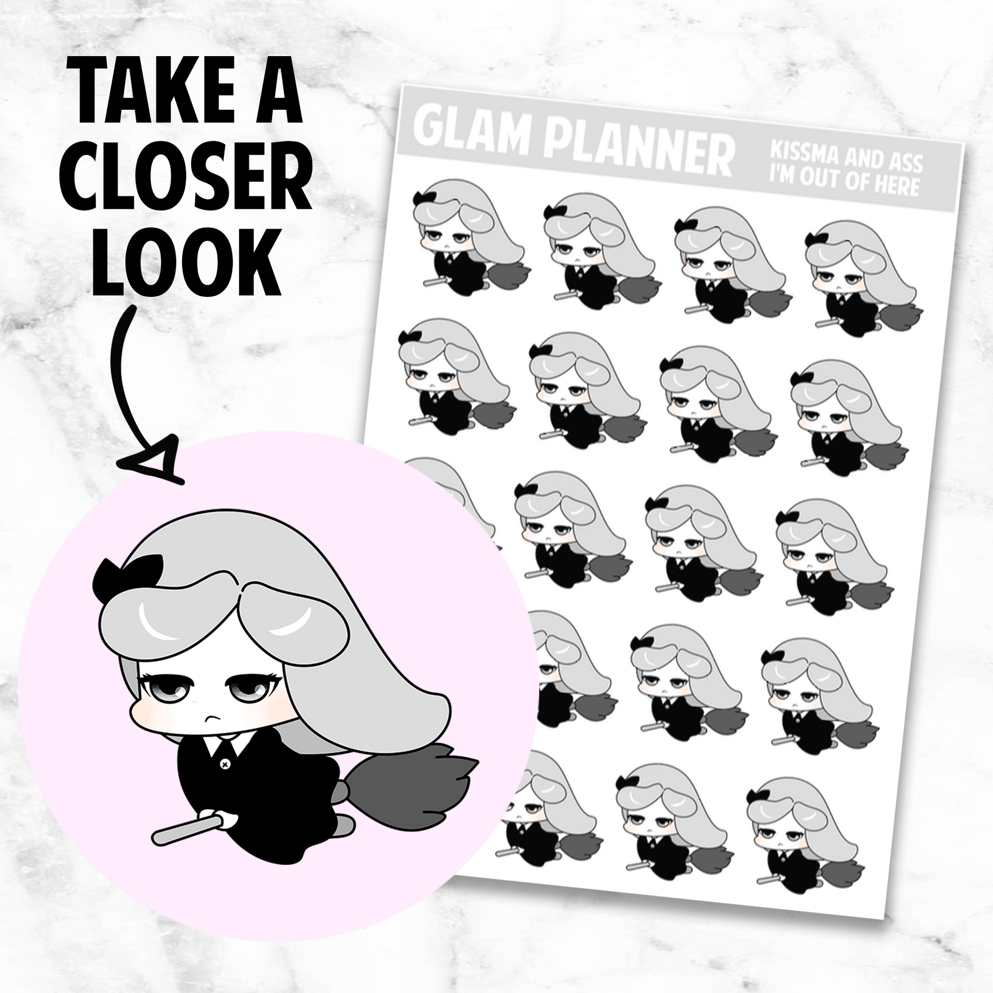 This listing is for one sheet of kiss cut stickers, as shown in the picture. The sticker sheet is approximately 2.5 inches by 3.5 inches big. These stickers are printed on glossy paper.